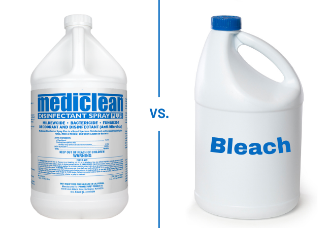 We get a lot of calls about using bleach to disinfect surfaces after a flood or other water intrusion. Just say no to bleach! Mediclean Disinfectant Spray Plus (MDSP) is the much better choice for many reasons – here are the top five: