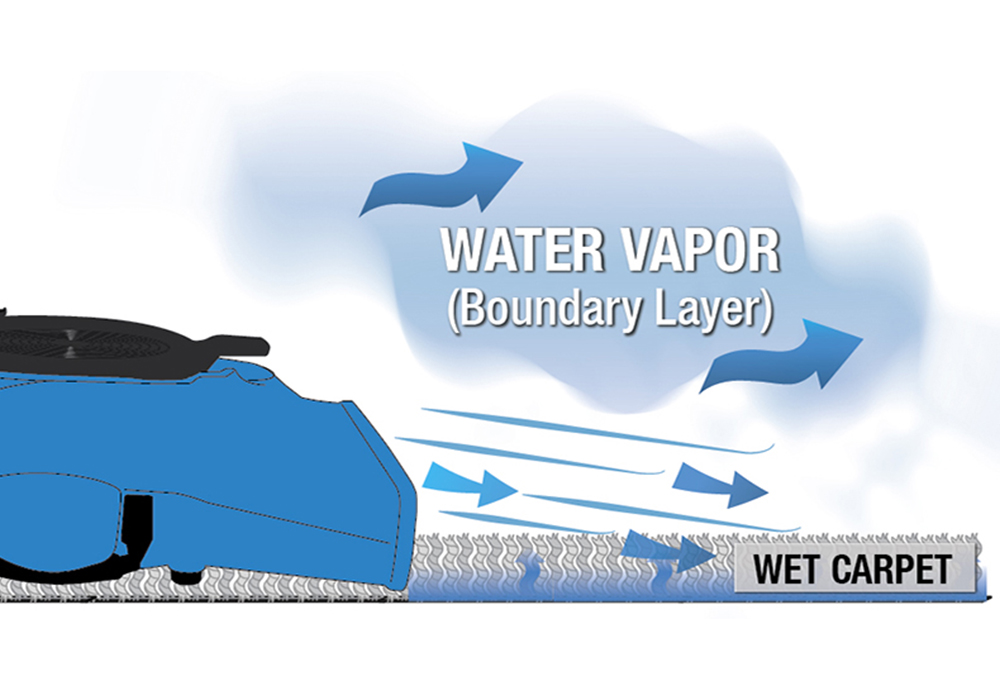 Moisture is trapped under carpet is a good example. In Class* 2 and 3 water intrusions, boundary layers are present around all wet porous materials because of the fast rate of evaporation and large amount of liquid water present. To release this moisture, high velocity airflow must be directed across its surface at an aggressive rate. High velocity air disrupts and removes the boundary layer, allowing the material to dry faster.