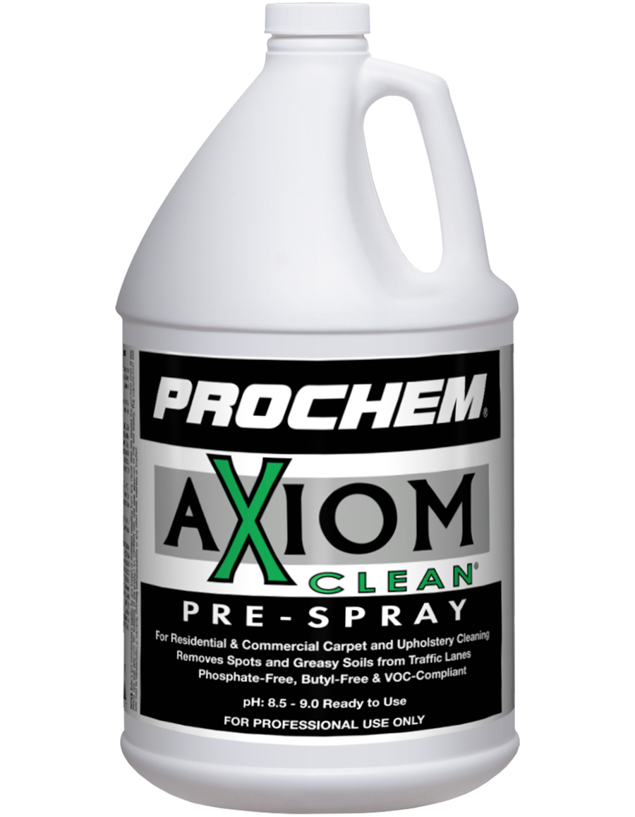 Tough on oils, grease and traffic lane soils, Axiom Clean Prespray is an optimal solution. Use this carpet and upholstery prespray as the first step in the two-step hot water extraction cleaning process. Ideal for synthetic fiber carpets, area rugs, and upholstery. For best results, follow with an Axiom Clean® extraction rinse.