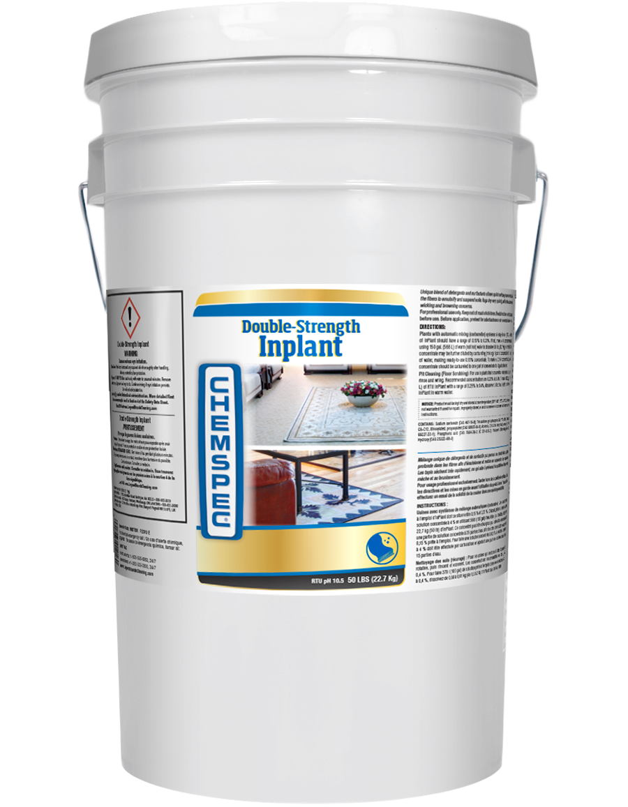 Double Strength Implant is a unique blend of detergents and surfactants that allows quick and deep penetration into the fibers to emulsify and suspend soils. Formulated for use in in-plant rug cleaning equipment. Rugs dry fast to help prevent wicking and browning.