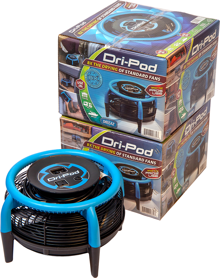Use the Dri-Pod to dry carpets and hard surfaces fast with 360-degree airflow! Enhance evaporation across floors and quickly remove surface moisture in small spaces. Unique design pulls warm, dry air from above and directs it down through a louvered grill across the floor - drying in all directions. The lightweight, stackable Dri-Pod is perfect for speed-drying carpet and floors, under furniture and inside cabinets. Onboard convenience outlet allows you to daisy-chain up to 8 Dri-Pods. It's also amazingly quiet!