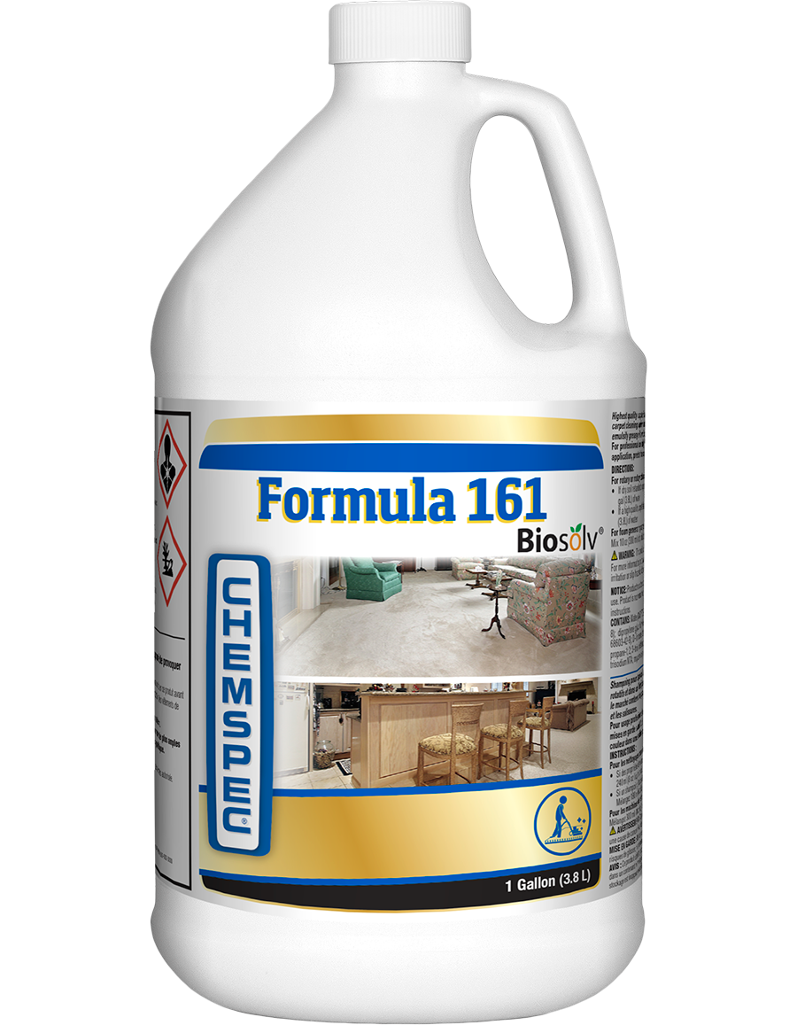 Our highest quality carpet shampoo, Formula 161 with Biosolv, is designed for use in rotary shampoo systems as well as foam-generating carpet cleaning equipment. Contains Biosolv to help break down and emulsify greasy oils and soils quickly.
