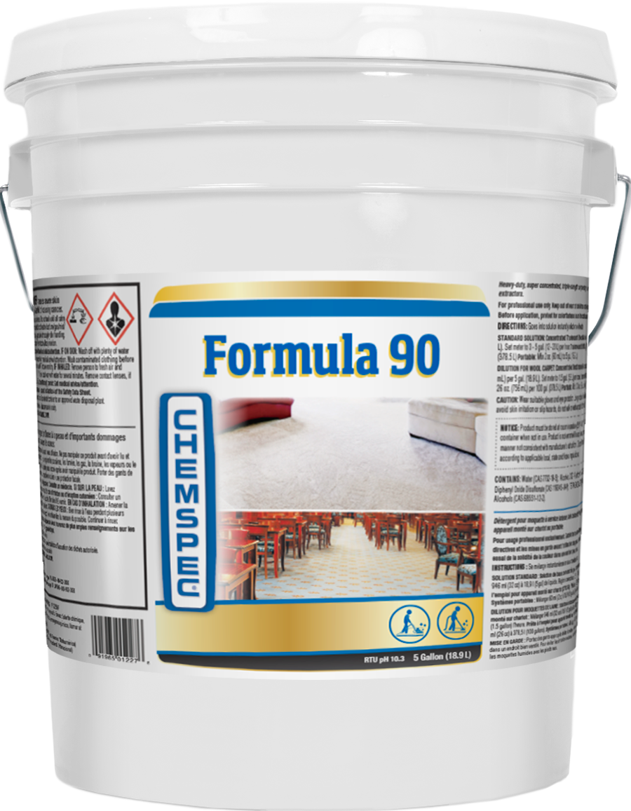 Formula 90 is a heavy-duty, highly concentrated, triple-strength carpet cleaning detergent for use with truckmounts or portable extractors. Delivers consistent, powerful cleaning on every job.