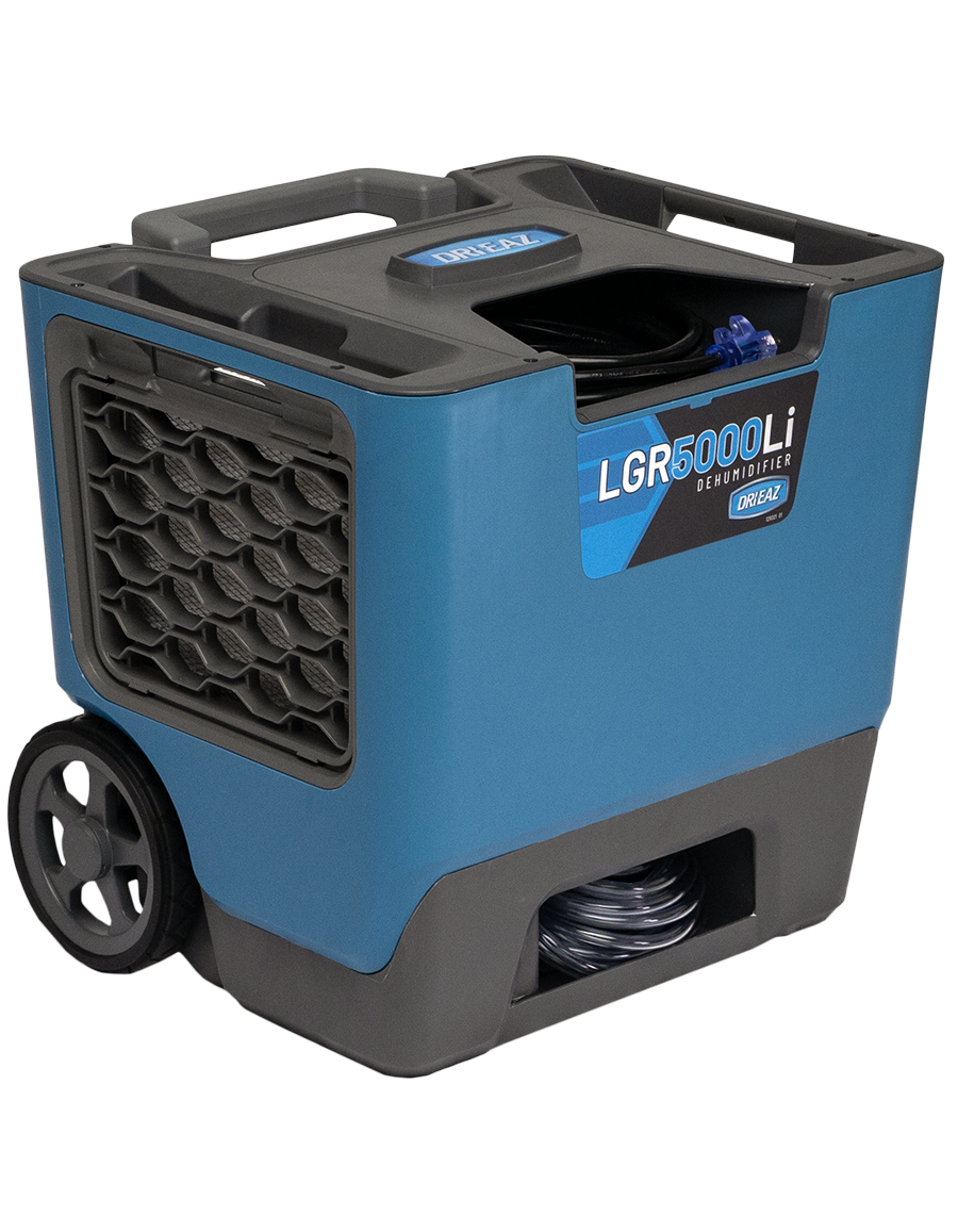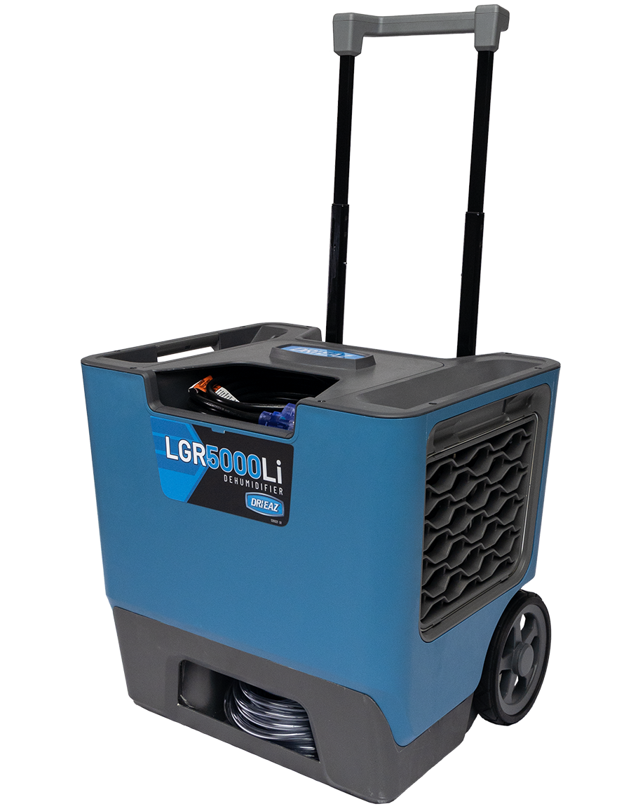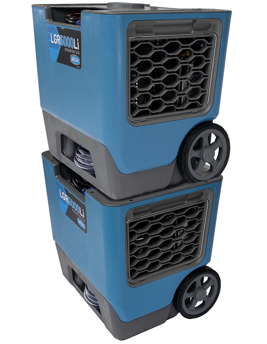 Stack two of the new compact Dri-Eaz LGR 5000 commercial dehumidifiers  to roll onto your next water damage restoration job to streamline the load in.  With max water removal of 164 pints, the ultra-compact LGR 5000Li portable dehumidifier is the perfect size for most water damage restoration jobs. It's also amazingly quiet, lightweight and draws only 5 amps.