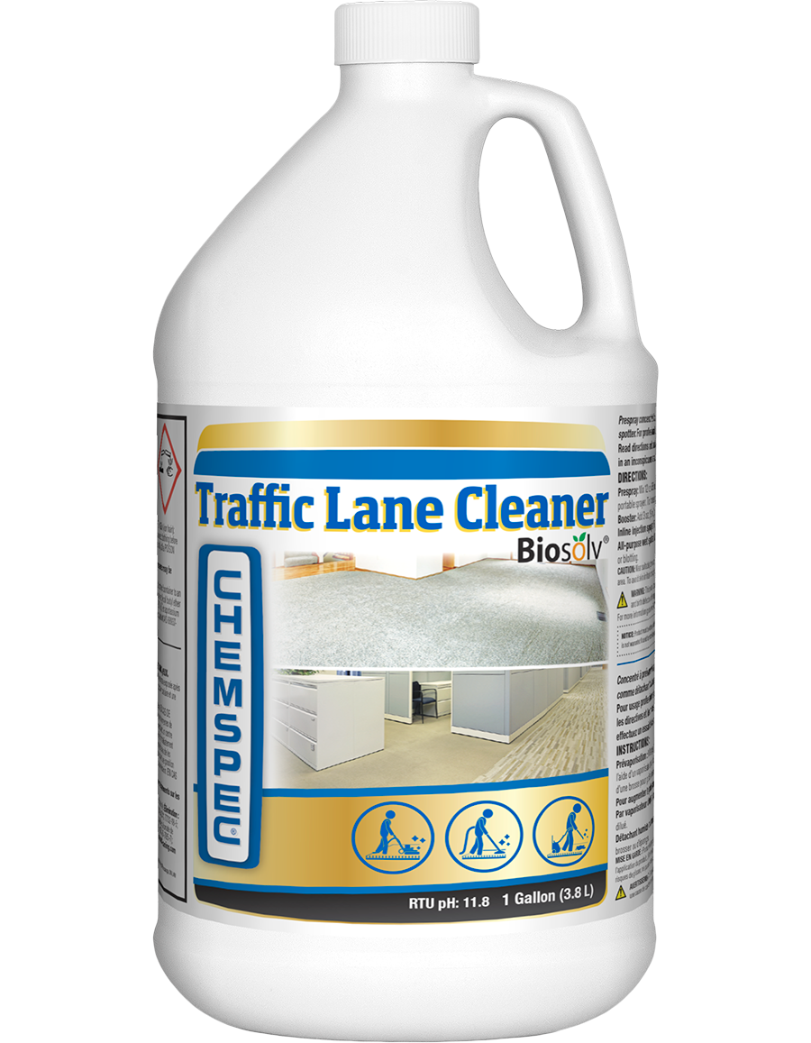 Chemspec's Traffic Lane Cleaner with Biosolv is a prespray concentrate for hard-to-clean carpet areas. Removes the heaviest soils while saving time and effort. Highly effective all-purpose spotter. Boosted with our Biosolv citrus additive for extra grease-cutting power.